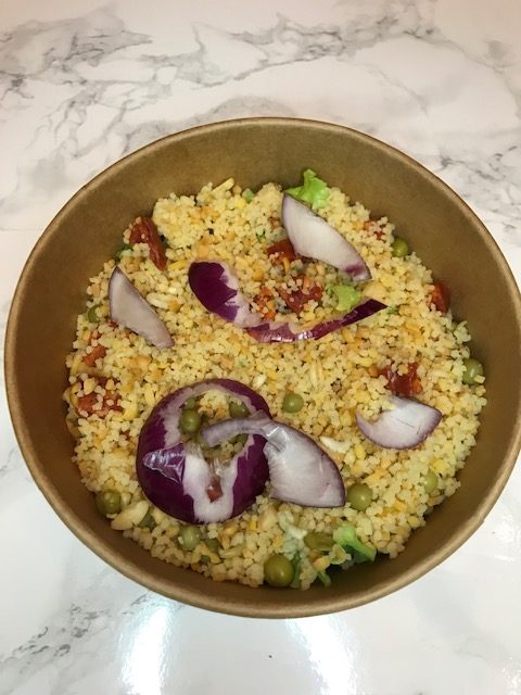 Quinoa Maïs concombre Batonnet de surimi Oignons rouges
